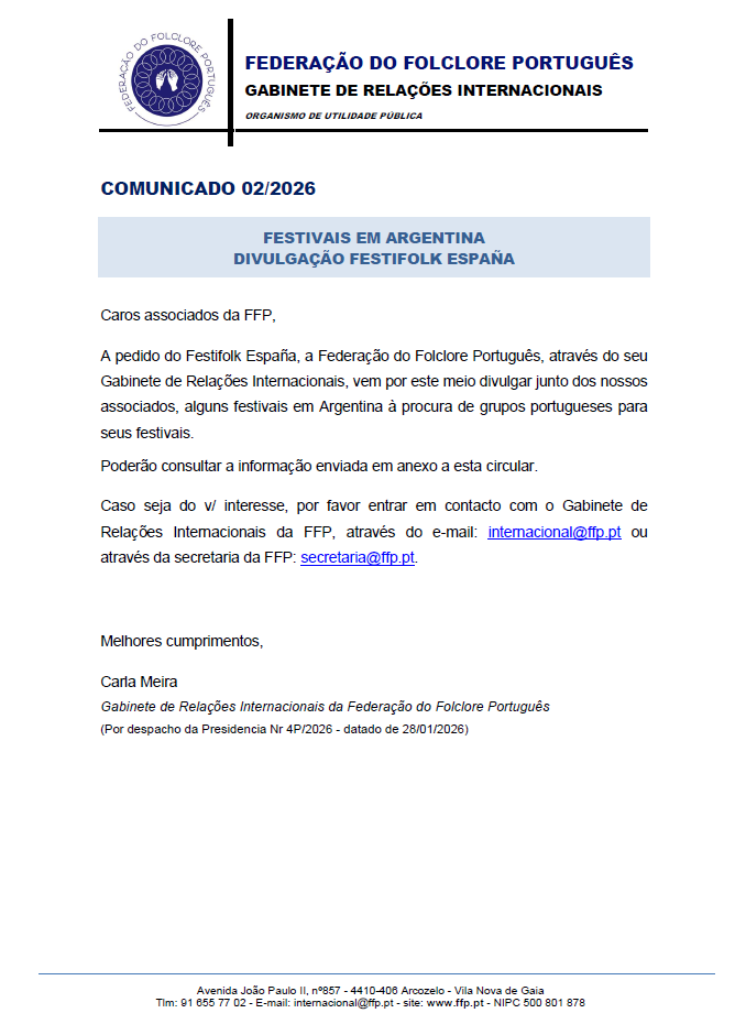 Convocam-se todos os associados para a Assembleia Geral da Federação do Folclore Português, a realizar no dia 12 de abril de 2026, pelas 14:00 horas, na sua sede, em Arcozelo - Vila Nova de Gaia.