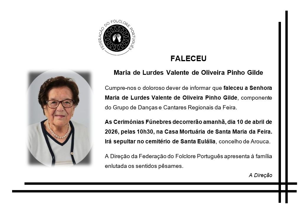 Cumpre-nos o doloroso dever de informar que faleceu a Senhora Maria de Lurdes Valente de Oliveira Pinho Gilde, componente do Grupo de Danças e Cantares Regionais da Feira.