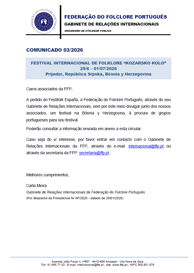 A Federação do Folclore Português, através do seu Gabinete de Relações Internacionais, vem por este meio divulgar um festival de folclore na República Checa, organizado pelo grupo Folklore Ensemble Haná Velká Bystřice.