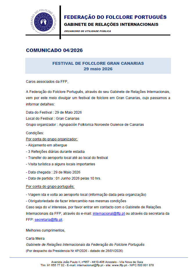 A Federação do Folclore Português, através do seu Gabinete de Relações Internacionais, vem por este meio divulgar um festival de folclore em Gran Canarias, cujo passamos a informar detalhes:
