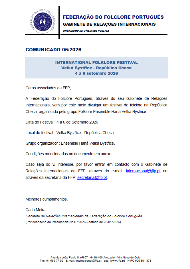 A Federação do Folclore Português, através do seu Gabinete de Relações Internacionais, vem por este meio divulgar um festival de folclore na República Checa, organizado pelo grupo Folklore Ensemble Haná Velká Bystřice.